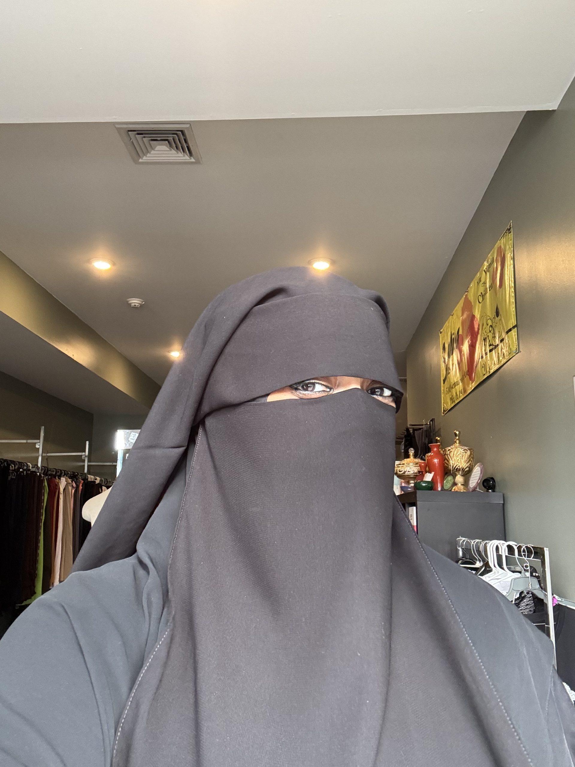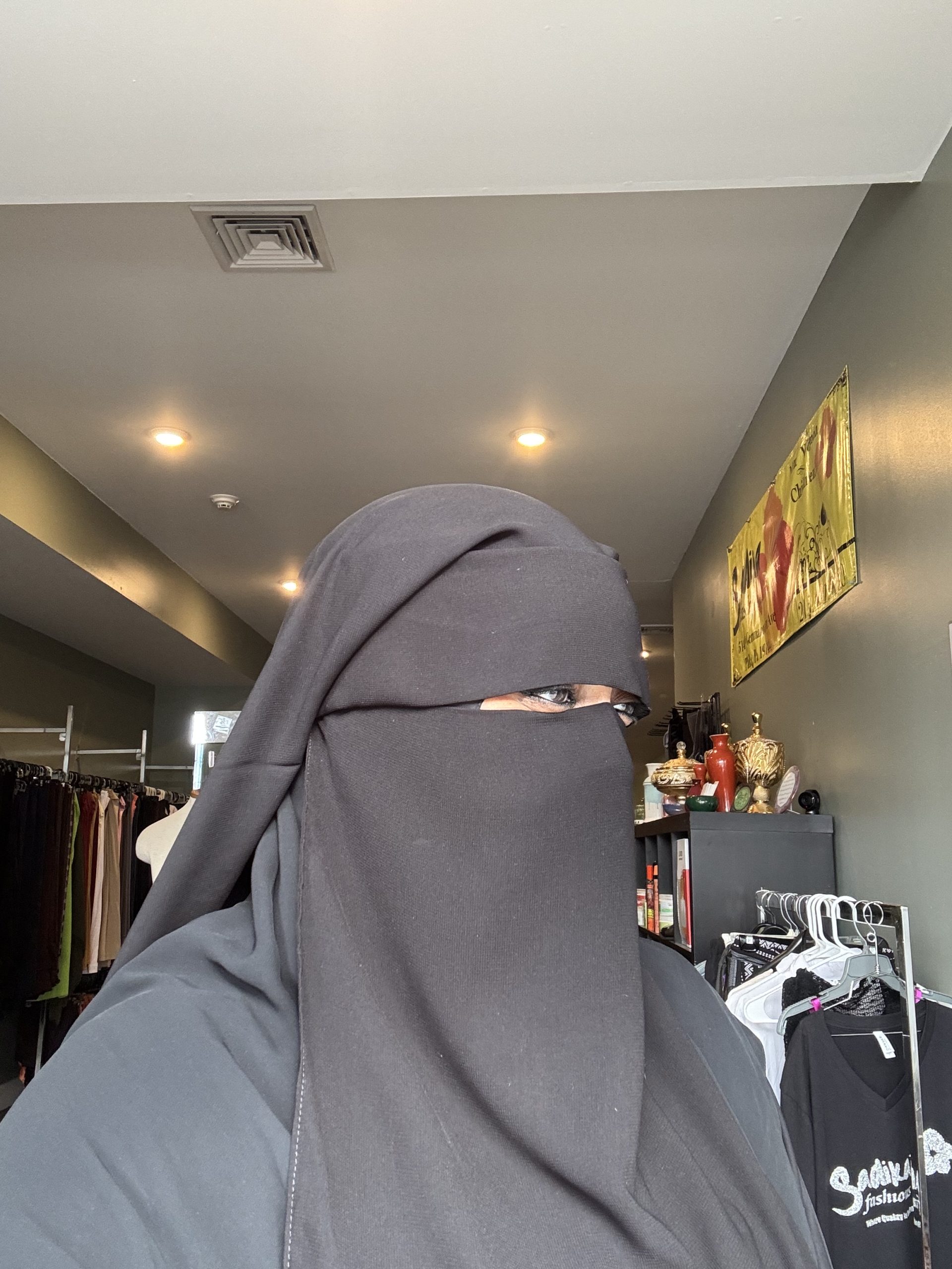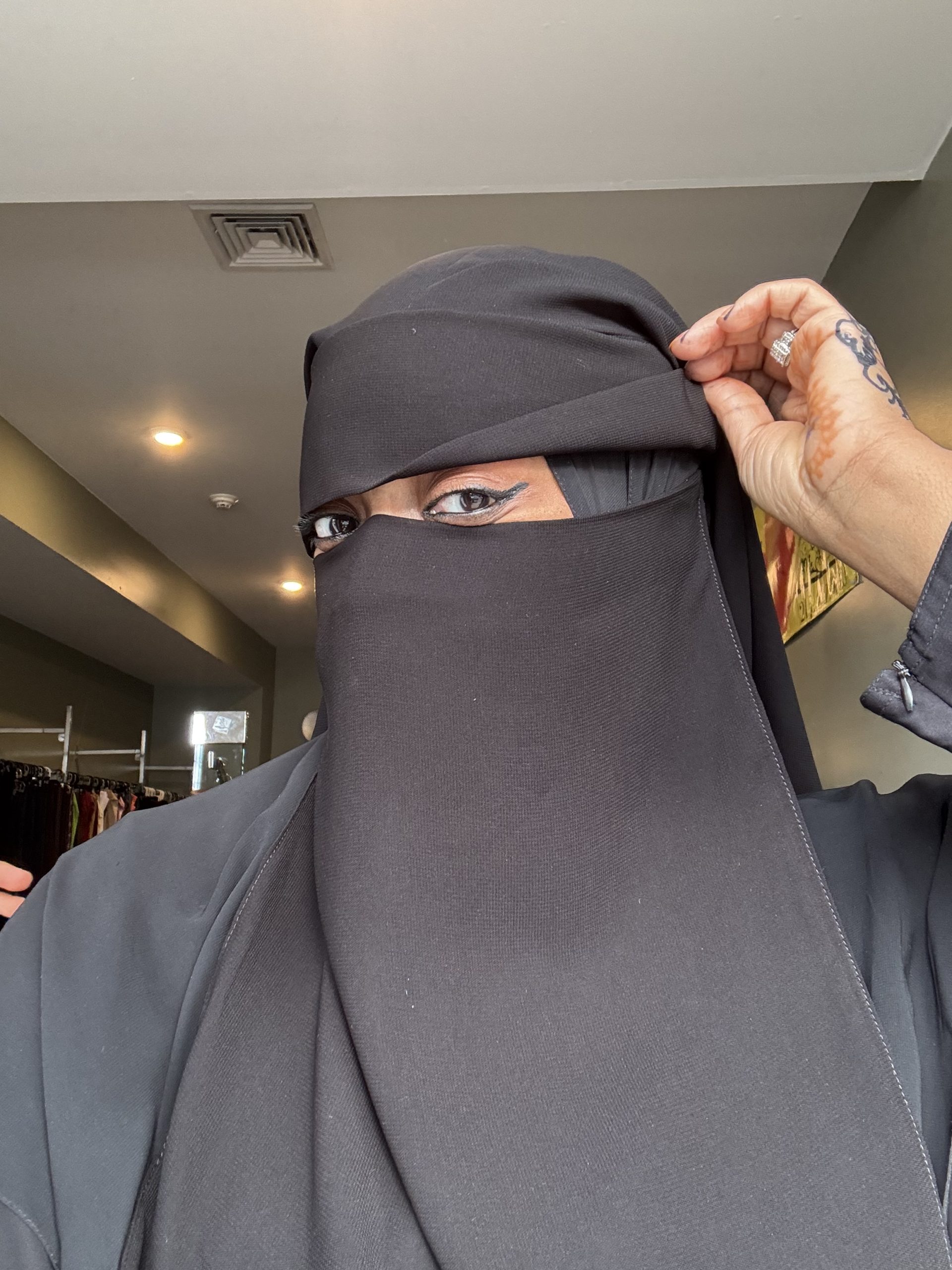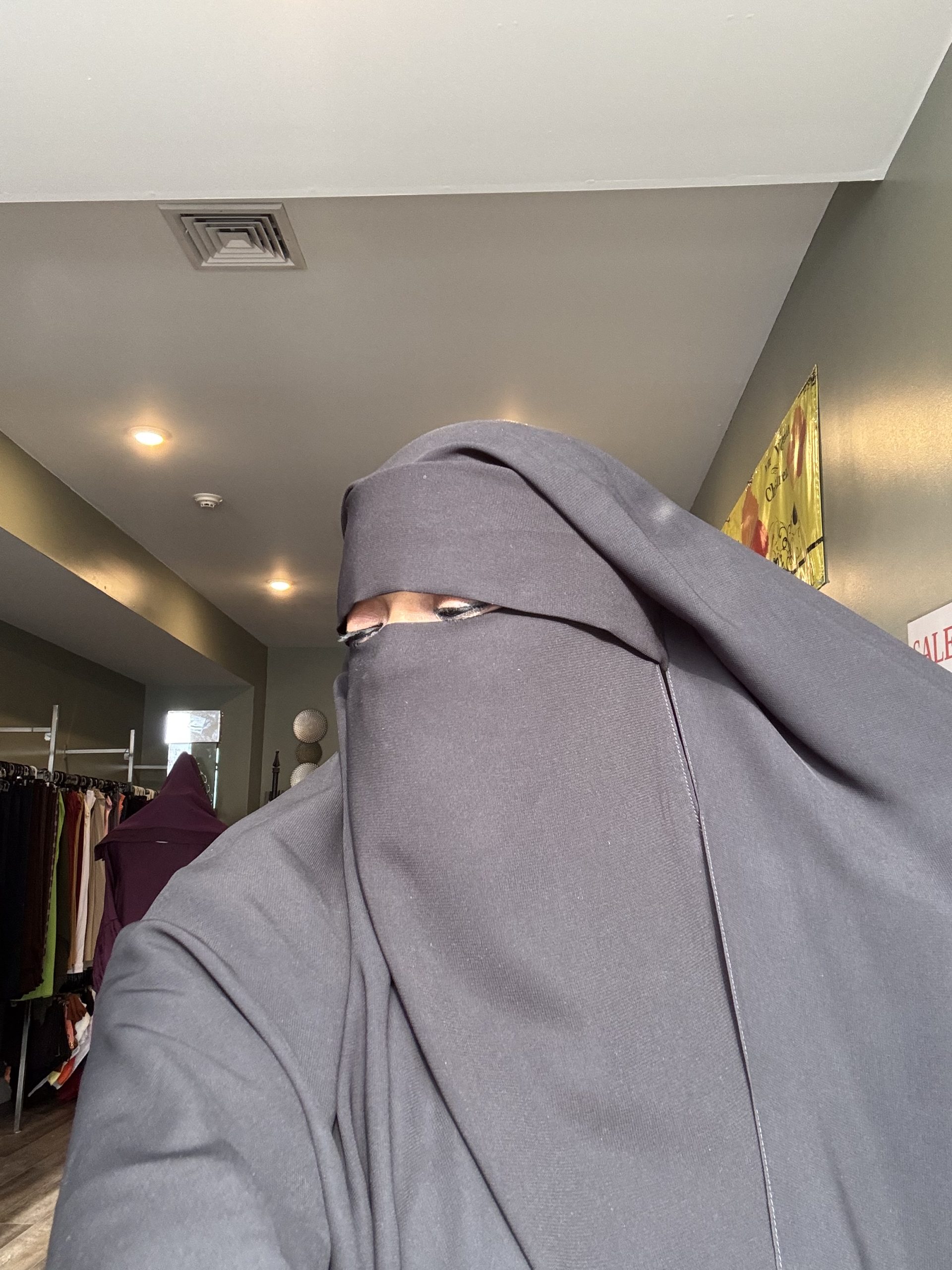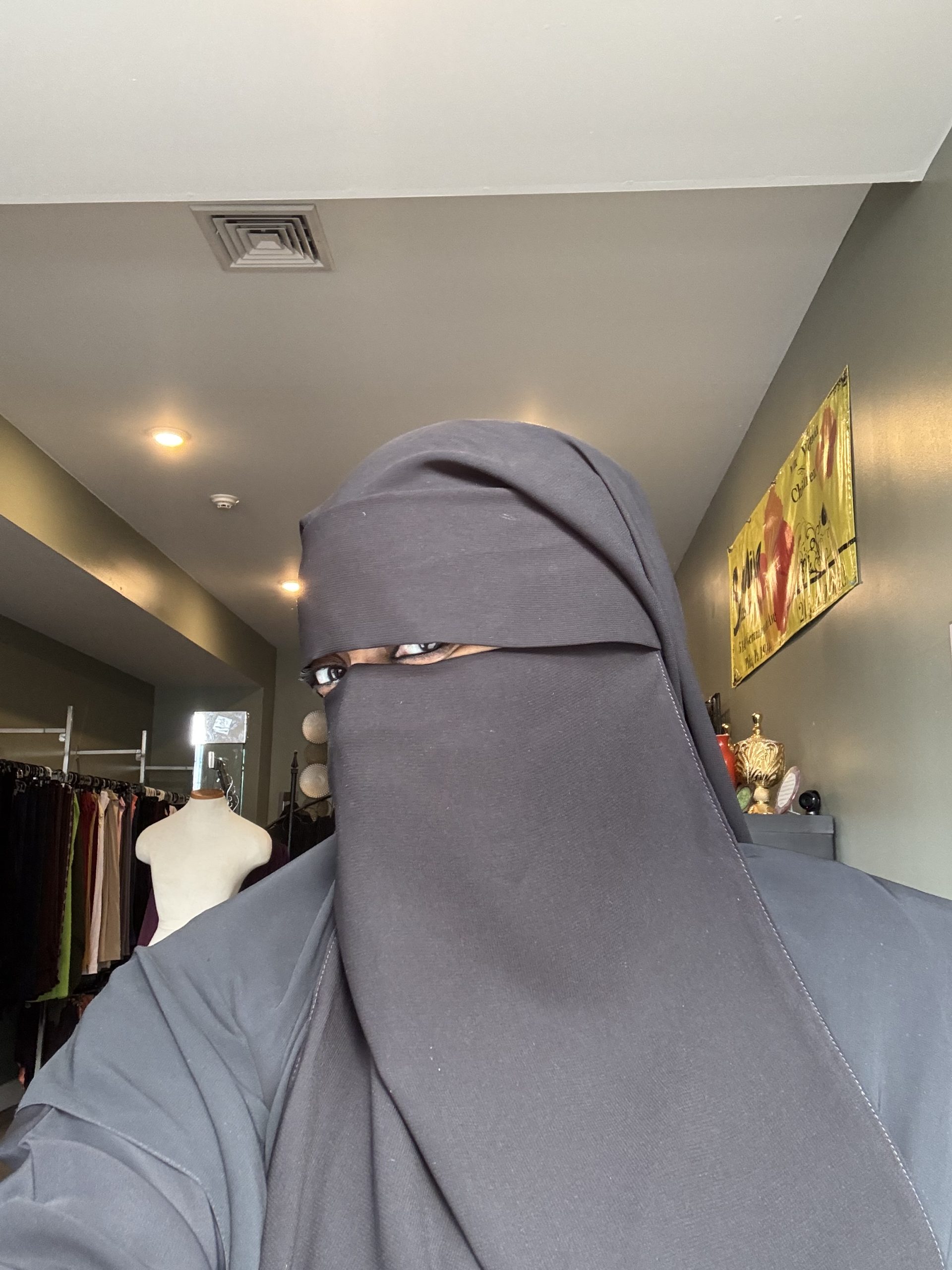 This niqab has a piece attached with snaps that can be worn as a screen behind you as pictured or pulled forward and snapped close as khimar.